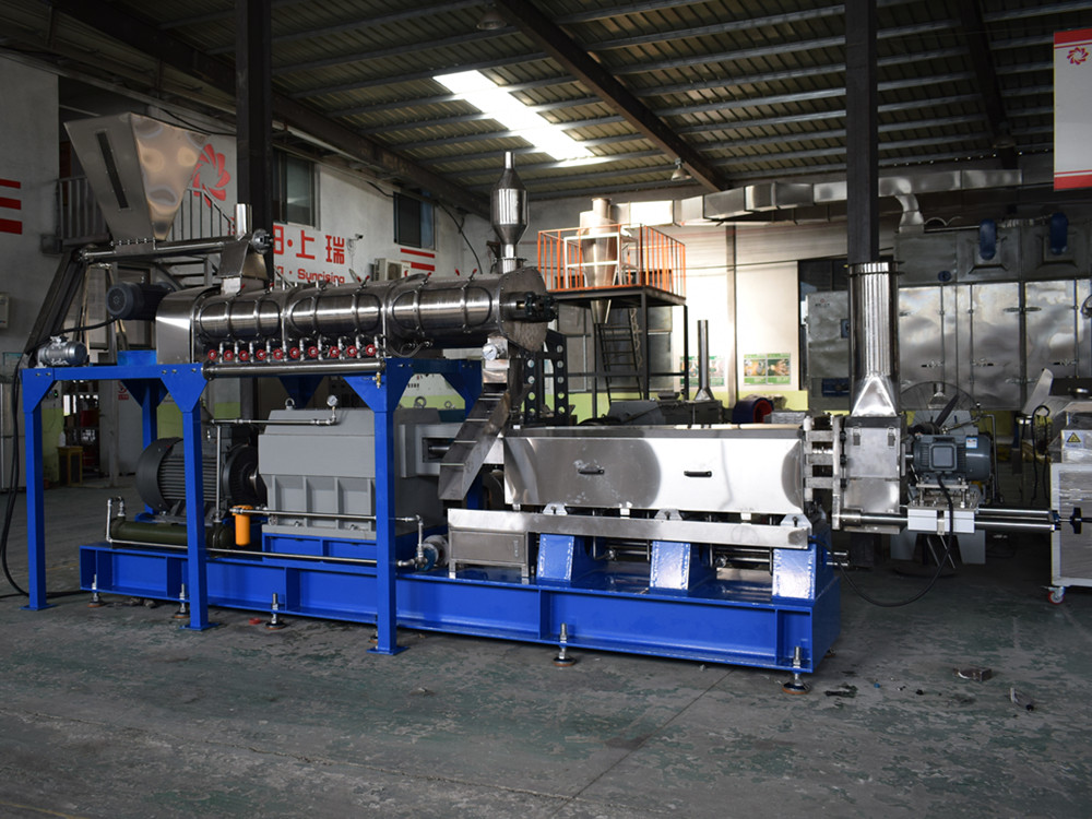 雙螺桿膨化機由供料系統(tǒng)、擠壓系統(tǒng)、旋切系統(tǒng)、加熱系統(tǒng)、冷卻系統(tǒng)、傳動系統(tǒng)、控制系統(tǒng)組成。該機適用原料廣泛、生產(chǎn)產(chǎn)品多樣,變頻調(diào)速、自動化程度高、運行平穩(wěn)、使用壽命長。